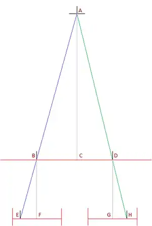 In the attached diagram the distance between the centers of the two camera lens is BD = BC + CD. The triangles are similar,
