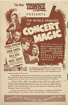 The earliest known concert film is the 1948 picture, Concert Magic. This concert features virtuoso violinist Yehudi Menuhin (1916–1999) at the Charlie Chaplin Studios in 1947. Together with various artists he performed classical and romantic works of famous composers such as Beethoven, Wieniawski, Bach, Paganini and others.