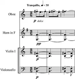 The work combines elements of Western art music and eastern European folk music, especially that of Hungary, and it departs from traditional tonality, often using non-traditional modes and artificial scales.[1] Bartók researched folk melodies, and their influence is felt throughout the work. For example, the second main theme of the first movement, as played by the first oboe, resembles a folk melody, with its narrow range and almost haphazard rhythm. The drone in the horns and strings also indicates folk influence (see example).[1]