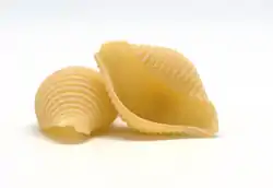 Conchiglie [koŋˈkiʎʎe], commonly known as "shells" or "seashells", is a type of pasta. It is usually sold in the plain durum wheat variety, and also in colored varieties which use natural pigments, such as tomato extract, squid ink or spinach extract. The shell shape of the pasta allows the sauce to adhere to it. A miniature variety called conchigliette is also available.