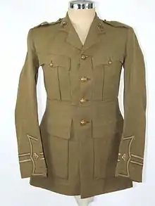 The regimental buttons had a harp and crown surrounded by a shamrock wreath. The harp and crown reappeared on cap and home service helmet badges, in silver on a green background.[43]