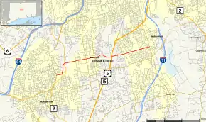 Route 175 begins at an intersection with Route 71 in New Britain. It heads east and north along the perimeter of Central Connecticut State University, then turns east again and intersects Route 9 at the Newington town line. In Newington, it continues east across town, intersecting with Route 173 and Route 176. At the Wethersfield town line, it meets US 5 and Route 15 (Berlin Turnpike) at a grade separated interchange, and continues east to end at an intersection with Route 99.[1]
