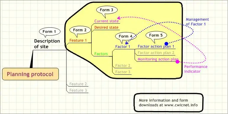 The sequence of identifying features, setting objectives, and then selecting the factors to be controlled by projects with scheduled work plans, comprises a management plan.