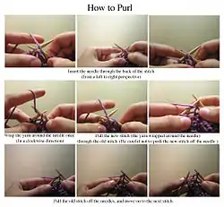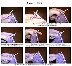 The motion of the right wrist is used to slip the right needle into the loop of the stitch being knitted and 'scoop' or 'hook' the yarn onto the right needle while the left forefinger holds the yarn across the back of the stitch. An alternative method of collecting the yarn involves using the thumb or index finger of the right hand to hold the yarn in place as the new stitch is being pulled out of the loop.