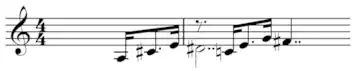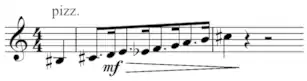 "Verbunkos" features polymodality or what Kárpáti terms alternative structures. For example, the framing motif of the first movement features, in relation to the root, A, the minor and major third and the perfect and diminished fifth:[4]