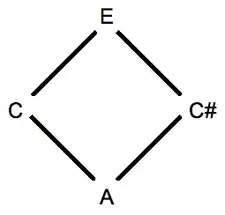 This mixed thirds structure may be thought of as bitonal in that the major and minor third of a triad are used. This structure may be extended through considering each third of the original triad as also being a possible third in a triad a half step in either direction. Thus C♯/D♭ is a major third in an A major triad and the minor third of a B♭ major triad: