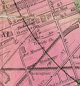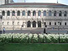 A significant number of important Boston educational and cultural institutions were originally located adjacent to (or very near) Copley Square, reflecting 19th-century Boston's aspirations for the location as a center of culture and progress.[6] These included the Museum of Fine Arts, the Massachusetts Institute of Technology, Harvard Medical School, the New England Museum of Natural History (today's Museum of Science), Trinity Church, the New Old South Church, the Boston Public Library, the American Academy of Arts and Sciences, the Massachusetts Normal Art School (today's Massachusetts College of Art and Design), the Horace Mann School for the Deaf, Boston University, Emerson College, and Northeastern University.