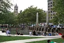 Known as Art Square until 1883,[7] Copley Square was originally cut diagonally by Huntington Avenue; it took its present form in 1961 when Huntington Avenue was truncated at the corner of Dartmouth Street, the Square partially paved, and a pyramidal fountain sculpture added.[8] In 1991, after further changes including a new fountain, the new Copley Square Park was dedicated. The nonprofit Friends of Copley Square raises funds for care of the square's plantings, fountain, and monuments.
