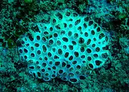 - Patch reef – common, isolated, comparatively small reef outcrop, usually within a lagoon or embayment, often circular and surrounded by sand or seagrass. Can be considered as a type of platform reef or as features of fringing reefs, atolls and barrier reefs.[40] The patches may be surrounded by a ring of reduced seagrass cover referred to as a grazing halo.[46]