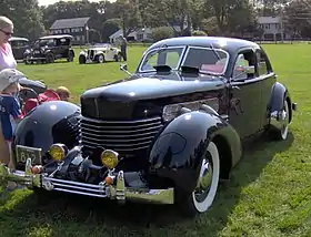 It also featured a concealed fuel filler door and variable-speed windshield wipers[1] (at a time when wipers were often operated by intake vacuum, and so tended to stop when the driver stepped on the gas pedal). Its engine-turned dashboard included complete instrumentation, a tachometer, and standard radio[1] (which did not become an industry standard offering until well into the 1950s).[8] The most famous feature was the "coffin nose", a louvered wraparound grille, from which its nickname derived,[1] a product of Buehrig's desire not to have a conventional grille.