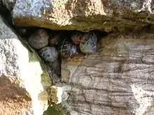 The snail's quiescent periods during heat and drought are known as aestivation; its quiescence during winter is known as overwintering. When overwintering, Cornu aspersum avoids the formation of ice in its tissues by altering the osmotic components of its blood (or haemolymph); this permits it to survive temperatures as low as −5 °C (23 °F).[3] During aestivation, the mantle collar has the ability to change its permeability to water.[4] The snail also has an osmoregulatory mechanism that prevents excessive absorption of water during hibernation. These mechanisms allow Cornu aspersum to avoid either fatal desiccation or hydration during months of either kind of quiescence.