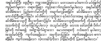 Oh King! please act always as the good and righteous kings from Mahasamata at the beginning of the world onwards. Oh King! do not be harsh to your vassals, bestow rewards on all deserving people love compassionately everyone as though they are children of your bosom, guard the welfare of everyone, treasure their lives as though your own May you be free of the obstructions of greed and anger, and give light to the darkness of stupidity. Oh King your actions must be only those that bring you credit, so must your words, your thoughts and zeal.