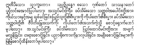 When the time was auspicious, eight princesses of high lineage with gold pots, eight daughters of heredity consecration Brahmans with silver pots, eight amat(Ministers) daughters of a long line of officers with earthern pots, eight daughters of heredity bankers with brass pots and eight daughters of hereditary rich men with iron pots in all their finery together with eight consecration Brahmans, Sasanapaing, four caravatin, eight amat, eight bankers, eight rich man, eight farmers and eight heads of san associations accompanied by music went to the river.