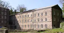 Cotton mills were not confined to Lancashire but were built in northeast Cheshire, Derbyshire, Nottingham, the West Riding of Yorkshire, Bristol, Durham and the west of Scotland.[12] The availability of streams or rivers to provide power determined the location of the early mills some of which were in isolated areas. In Lancashire they were built on the rivers and streams descending from the Pennines and Rossendale moorland. In some places quite small streams powered a string of small mills such as in the Cheesden Valley between Ramsbottom and Heywood.[92] where 14 mills and their associated leats and ponds were concentrated along a four-mile stretch of the brook. Mills were built around Rochdale and Littleborough. North of Bury, ten mills occupied a mile long stretch of a stream in the Shuttleworth Valley.[93] Other mills were built north of the River Ribble and a cluster of five mills in Caton near the port at Lancaster, one of which belonged to Samuel Greg who built Quarry Bank Mill at Styal in Cheshire. Not all water-powered mills were in rural areas, after 1780 mills were built in Blackburn and Burnley.[94]
