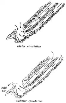 A theory about the origin of this mine states that during the winter, cold air over the hilltop sinks into rock openings in the Lock Haven Formation (Devonian age) and slowly expels the warm air that had penetrated these openings during the preceding summer. Ordinarily this process takes place locally, but here the interconnection of the rock crevices tends to be so arranged that the air circulation over a wide region is focused on one spot. Thus, from April or May to September, cold air comes in contact with percolating groundwater, forming ice during the hot months of the year; from September to late spring, warm air trapped in the rocks from the preceding summer escapes and melts the ice.[1]