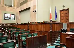 The Sejm can pass a vote of no confidence on an individual minister if the motion receives the support of at least 69 deputies.[22] If the motion is successful, passed by a majority vote, the president will recall the minister from office.[23] Similarly, if the council of ministers loses its majority support within the Sejm, the cabinet can be forced to resign in a constructive vote of no confidence.[17] The motion must be approved by at least 46 deputies, and then passed by a majority vote.[24] In such an event, a new prime minister must be simultaneously appointed.[17] The prime minister is also empowered to call a vote of confidence in the cabinet, requiring a majority vote from at least half of all present deputies.[25] In the event of the prime minister's resignation or death, the president can either accept or refuse the cabinet's resignation of office.[26] Following a parliamentary election, the premier must submit the cabinet's resignation in the first sitting of the newly elected Sejm.[27] After its resignation, the cabinet is entrusted to continue administering state functions until the appointment and oaths of office of the new government.[3]