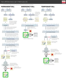 Due to public pressure and the demands of handling the district's complex day-to-day affairs, Congress eventually agreed to devolve certain powers over the district to an elected local government. However, lawmakers in Congress during the early 1970s had originally sought to re-institute the post of governor and create a 25-member legislative assembly. Local officials opposed this form of government, insisting that the district's status as a municipality be respected.[12] On December 24, 1973, Congress obliged the demands of local residents and enacted the District of Columbia Home Rule Act, providing for an elected mayor and the 13-member Council of the District of Columbia.[13] The council has the ability to pass local laws and ordinances. However, pursuant to the Home Rule Act all legislation passed by the D.C. government, including the district's local budget,[14] remains subject to the approval of Congress.[15] After signing the bill, President Richard Nixon said, "I believe the legislation skillfully balances the local interest and the national interest in the way the District of Columbia is governed."[14]