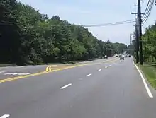 CR 547 heads east for a brief concurrency with four-lane Route 33 after the circle before turning northeast onto four-lane undivided Shafto Road. South of this intersection, Monmouth County maintains Wyckoff Road as a section of CR 547 for 0.45 miles (0.72 km) to Route 34.[3] The road continues into Tinton Falls and passes through a mix of farms and woods before continuing into forested areas with some commercial development. Upon crossing CR 16, the road runs between Naval Weapons Station Earle to the west and wooded residential and commercial development to the east. CR 547 passes through dense forests before intersecting CR 38 and passing under the Garden State Parkway. The road intersects CR 38 again after and enters Eatontown at the CR 51 junction, where the name becomes Wyckoff Road. A short distance later, the route comes to a partial interchange providing access to and from the southbound direction of the Route 18 freeway before heading into wooded residential neighborhoods. CR 547 widens to a divided highway as it passes the Monmouth Mall and comes to an intersection with Route 36. The road passes more businesses as it becomes undivided and comes to the Route 35 junction a short distance later. CR 547 continues past more homes before it reaches an intersection with Route 71.[1][2]