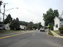 At this point, CR 547 turns east to form a concurrency with CR 528 on East Veterans Highway, with CR 639 continuing north on South Hope Chapel Road. The two routes continues through residential and commercial development, intersecting CR 626 before crossing into Lakewood Township. At this point, CR 528/CR 547 becomes Lakewood-New Egypt Road and turns northeast into wooded residential neighborhoods. In this area, the routes turn east onto Central Avenue and passes more homes before crossing Lake Carasaljo and coming to an intersection with US 9. At this point, CR 528 continues northeast on Hurley Avenue and CR 547 turns north to follow US 9 on Madsion Avenue, crossing the Metedeconk River, which Lake Carasaljo is formed from. After intersecting the western terminus of Route 88, Madison Avenue continues north through the commercial and residential center of Lakewood as a four-lane undivided road, with CR 547 splitting from US 9 by turning east onto two-lane 8th Street. The route passes through residential areas before splitting from 8th Street by turning northeast onto Squankum Road. Signage along US 9 shows CR 547 leaving the concurrency at 9th Street.[2] Along this stretch, CR 547 runs through wooded areas of homes, crossing CR 526.[1][2]
