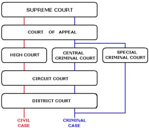 The Courts of Ireland consist of the Supreme Court, the Court of Appeal, the High Court, the Circuit Court, the District Court and the Special Criminal Court. With the exception of the Special Criminal Court, all courts exercise both civil and criminal jurisdiction, although when the High Court is exercising its criminal jurisdiction it is known as the Central Criminal Court.