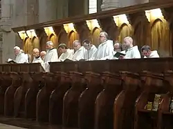 Among the Benedictines, in choir, at chapter, and at certain other ceremonial times, a long full gown with large flowing sleeves, called a "cowl", is worn over the ordinary habit. Black has been the prevailing color, hence the term "black monk" has come to signify a Benedictine.[2] Similarly, the Cistercians are known as the "White Monks", in reference to the color of the "cuculla" or white choir robe worn over their habits, as opposed to the black cuculla worn by Benedictine monks. "The Carthusian wears the ordinary monastic habit in white serge, but the scapular which is joined by bands at the side and has the hood attached to it, is known as the "cowl". The long flowing garment with wide sleeves, which usually bears this name, is used only by the deacon at high Mass."[3]