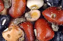 Severe C. maculatus infestations can affect 100% of the stored peas and cause up to 60% loss within a few months.[42][43] The weevil generally enters the cowpea pod through holes before harvest and lays eggs on the dry seed.[44] The larvae burrow their way into the seed, feeding on the endosperm. The weevil develops into a sexually mature adult within the seed.[45] An individual bruchid can lay 20–40 eggs, and in optimal conditions, each egg can develop into a reproductively active adult in 3 weeks.[46] The most common methods of protection involve the use of insecticides, the main pesticides used being carbamates, synthetic pyrethoids, and organophosphates.[47]