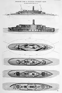 On 27 February 1856, Coles was made captain. He was placed on half pay after the war ended and spent his time creating designs for turret ships. Up to this time the principal armament of warships had been batteries of guns firing from fixed ports in the sides of the ship. On 10 March 1859 he filed a patent for a revolving turret, although it is not clear how he came by the idea. The American USS Monitor, constructed by John Ericsson in 1861, incorporated a revolving turret and Ericsson claimed the idea of a revolving protected gun was an old one. The Times suggested that Marc Brunel had given Coles the idea. Coles' design aim was to create a ship with the greatest possible all round arc of fire, as low in the water as possible to minimise the target. This proved to be a weakness in designs he created, because he was unwilling to compromise these aims for the practical necessities of sailing ships' rigging, decks sufficiently high to be clear of heavy seas and other necessary superstructures which restricted the guns' rotation.[2]