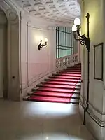 The staircase requires half a revolution per floor. The flight of management stairs, closest to the entrance to the Boulevard des Italiens, leads to the executives and the council chamber in a revolution (the first half-revolution ends in the mezzanine floor which houses offices around the entrance halls with high ceilings)