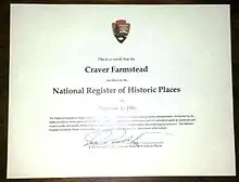 The Craver Farmstead is listed on the National Register of Historic Places as certified by the U.S. Department of the Interior.[2]