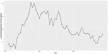 Canada's homicide rate per capita (per 100,000) inhabitants has been declining since a peak in the 1970s. After dropping to a low point of 1.44 homicides per 100,000 inhabitants in 2013, Canada's homicide rate has been rising again.[6] In 2015 the rate rose to 1.68 per 100,000 people, up from 1.47 the previous year.[7] According to Statistics Canada data from 2016, police reported 611 homicides across Canada in 2016, a rate of 1.68 per 100,000 people.[8] Canada's national homicide rate 2017 was the highest it's been in a decade, Statistics Canada says, because of a spike in gang-related violence and shootings. The agency said there were 660 reported homicides in Canada last year. Not only was that an increase of nearly eight per cent from 2016, it also pushed up the homicide rate to 1.8 victims for every 100,000 people, the highest since 2009.[9] The agency also said the rates of other serious offences, including attempted murder, sexual assault, robbery and aggravated assault were all up last year, as was the use of guns in violent crimes.[9]