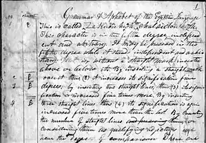 The collection of manuscripts Smith and his scribes produced is now known as the Kirtland Egyptian papers.[22][23] One of the manuscripts in this collection was a bound book simply titled "Grammar & A[l]phabet of the Egyptian Language" (GAEL), which contained Smith's interpretations of the Egyptian glyphs.[24][23] This manuscript details Smith's belief that hieroglyphics had five "degrees" of interpretation, with each "degree" representing a deeper, expanded, and more complex level of interpretation.[25] This manuscript illustrates Smith's method for translating the papyri, which he continued with his translation of the Book of Abraham: The scribes sketched out the hieroglyphic characters from the papyri onto the left-hand side of the manuscript. Smith then gave his English translation of the glyph, along with an explanation for how one would pronounce the character.[25]