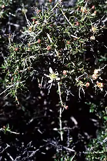 The species is a shrub that grows up to 1–2 metres (3.3–6.6 ft) tall. It is intricately divided into thorn-tipped branches lined with clusters of small, deciduous, gray-green leaves no longer than about 1.5 centimeters. The inflorescence bears a single flower, which has 5 white to purple-tinged petals about a centimeter long and narrowing to claws at their bases.[1]