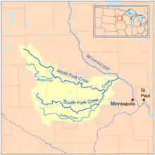 The Crow River is a tributary of the Mississippi River in south-central Minnesota in the United States. It drains a watershed of 2,756 square miles (7,140 km2).