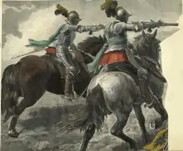 The adoption of the pistol as the primary weapon led to the development of the stately caracole tactic, where cuirassiers fired their pistols at the enemy, then retired to reload whilst their comrades advanced in turn to maintain the firing. Following some initial successes, this tactic proved to be extremely ineffective as infantry, with superior firearms and numbers, could easily outgun the cuirassiers. The change from cavalry being reliant on firearms, to shock-capable close combat cavalry reliant mainly on the sword was often attributed to Gustavus Adolphus of Sweden in the 1620s and 1630s.[6] Gustavus Adolphus also reduced the number of ranks in a cavalry formation from the previously usual six to ten, for pistol-based tactics, to three to suit his sword-based shock tactics, or as a partial remedy to the frequent numerical inferiority of his cavalry arm.[7]