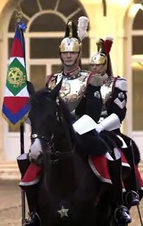 Cuirassiers use the same uniforms which were established in 1878 but with some slight differences.[11] Lance corporals and brigadiers wear single-breasted horse jackets while marshals and officers wear the double-breasted ones. In special circumstances, for example during guard shifts or ceremonies in the Quirinal, Cuirassiers wear mess dress uniforms, helmets with chinstraps and horse hair crests. During particular honour services, like the Italian Republic Day on 2 June, the distinctive cuirasses of the regiment are worn.