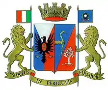 The decree of the President of the Republic of 24 December 1986 had given a coat of arms for the Cuirassiers. It is a shield divided in two parts: on the left side, there are the colours representing the Italian capitals where the regiment had served (blue for Turin, silver for Florence and red for Rome) with a black eagle (symbol of the House of Savoy) above with the acronym "RI" (Repubblica Italiana), while on the right there is the coat of arms of the Arma dei Carabinieri.[13] The shield is surmounted by a mural crown and it is sustained by two golden lions which bear the Italian Flag (left) and the Presidential standard (right).[13]
