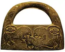 Lions have been extensively used in ancient Persia as sculptures and on the walls of palaces, in fire temples, tombs, on dishes and jewellery; especially during the Achaemenid Empire. The gates were adorned with lions.[18]