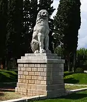 Lions have been widely used in sculpture to provide a sense of majesty and awe, especially on public buildings. Lions were bold creatures and many ancient cities would have an abundance of lion sculptures to show strength in numbers as well.[12][13] This usage dates back to the origin of civilization.[14] There are lions at the entrances of cities and sacred sites from Mesopotamian cultures; notable examples include the Lion Gate of ancient Mycenae in Greece that has two lionesses flanking a column that represents a deity,[15] and the gates in the walls of the Hittite city of Bogazköy, Turkey.[13] The "Lion of Menecrates" is a funerary statue of a crouching lioness, found near the cenotaph of Menecrates. The lion is by a famous Corinthian sculptor of Archaic Greece, end of the seventh century BC, and is now in the Archaeological Museum of Corfu.