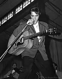 In an interview with PBS television, social historian Eric Lott said, "all the citizens' councils in the South called Elvis 'nigger music' and were terribly afraid that Elvis, white as he was, being ambiguously raced just by being working-class, was going to corrupt the youth of America."[37] Robert Kaiser says Elvis was the first who gave the people "a music that hit them where they lived, deep in their emotions, yes, even below their belts. Other singers had been doing this for generations, but they were black."[38] Therefore, his performance style was frequently criticized. Social guardians blasted anyone responsible for exposing impressionable teenagers to his "gyrating figure and suggestive gestures." The Louisville chief of police, for instance, called for a no-wiggle rule, so as to halt "any lewd, lascivious contortions that would excite the crowd."[38] Even Priscilla Presley confirms that "his performances were labeled obscene. My mother stated emphatically that he was 'a bad influence for teenage girls. He arouses things in them that shouldn't be aroused.'"[39]