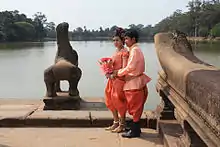The traditional wedding is a long and colorful affair. Formerly it lasted three days, but in the 1980s it more commonly lasted a day and a half. Buddhist priests offer a short sermon and recite prayers of blessing. Parts of the ceremony involve ritual hair cutting, tying cotton threads soaked in holy water around the bride's and groom's wrists, and passing a candle around a circle of happily married and respected couples to bless the union. After the wedding, a banquet is held. Newlyweds traditionally move in with the wife's parents and may live with them up to a year, until they can build a new house nearby.[4] The majority of married Cambodian couples do not obtain legal marriage documents. Marriage is seen more as a social institution, regulated by societal pressures, expectations and norms, than a legal matter. This practice continues today. All that is necessary for a couple to be considered married by the community is to have a ceremony, after which a party is often held for family, friends and well-wishers to celebrate. This is how the overwhelming majority of Cambodian couples marry. Whether these traditional marriages are considered legal contracts by the government and courts is unclear. Therefore, when a couple separate, they likewise need not obtain divorce documents.
