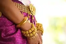 Dancers wear a collar known as Sarong Kor around their necks. Importantly, they wear a unique skirt called Sampot sara-bhap (lamé), made from silk inter-woven with gold or silver threads, forming elaborate and intricate designs that shimmer as the dancers move. This is held in place with a bejewelled belt. A multitude of jewellery is also worn by the female dancers. These include earrings, several pairs of bangles, a garland of flowers in the form of a bracelet, bracelets, anklets and an armlet that is worn on the right. Several body chains cross over the body like a sash. A circular or diamond shaped pendant is worn around the neck.