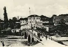 - Abdullah Pashë Dreni House, built in 1790, is a three-floor building in the shape of a tower, which served as a private house and a fortress. It was built out of stone and bricks and it has small windows.[15] Nowadays, the first floor cannot be seen from the outside due to the increase in level of the main road which connects two parts of the city through the Islam Beg Bridge. Apart from its architectural value, this building also has historical significance. When Marshall Mehmet Ali Pasha visited Gjakova in order to oversee the cession of that region to the Principality of Montenegro, he was killed along with many Ottoman soldiers in this house.[13]