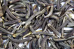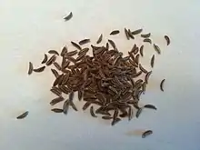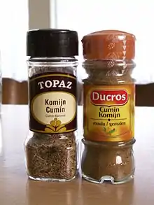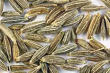Cumin (/ˈkjuːmɪn/[2][3] or US: /ˈkuːmɪn/,[2][4][5][6] or /ˈkʌmɪn/[2][3]) (Cuminum cyminum) is a flowering plant in the family Apiaceae, native to a territory including the Middle East and stretching east to India.[7] Its seeds – each one contained within a fruit, which is dried – are used in the cuisines of many cultures in both whole and ground form. Although cumin is thought to have uses in traditional medicine, there is no high-quality evidence that it is safe or effective as a therapeutic agent.[8]