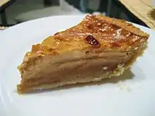 A custard pie is any type of uncooked custard mixture added to an uncooked or partially cooked crust and baked together.[1] In North America, custard pie commonly refers to a plain mixture of milk, eggs, sugar, salt, vanilla extract and sometimes nutmeg combined with a pie crust. It is distinctly different from a cream pie, which contains cooked custard poured into a cooled, precooked crust. In the United Kingdom, the comical or political act of pieing is conventionally done with a "custard pie". Some common custard pies include pumpkin pie, lemon and buttermilk chess pie, coconut cream pie, and buko pie. True custard is defined as a liquid thickened with eggs. Due to the often large number of whole eggs in custard pie it is a very rich pie.