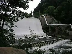 The FirstEnergy Dam was built by the Northern Ohio Traction and Light Co. in 1912 to serve the dual functions of generating hydropower for its local streetcar system and providing cooling-water storage for a coal-burning power plant; however, the hydropower operation was discontinued in 1958, and the coal-burning plant was decommissioned in 1991.[36] Some environmental groups and recreational groups want the dam removed.[37] Others contend such an effort would be expensive and complicated, for at least two reasons: first, the formerly hollow dam was filled in with concrete in the early 1990s, and second, because of the industrial history of Cuyahoga Falls, the sediment upstream of the dam is expected to contain hazardous chemicals, possibly including heavy metals and PCBs. The Ohio EPA estimated removal of the dam would cost $5–10 million, and removal of the contaminated sediments $60 million.[38] The dam is licensed through 2041.