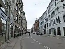 Roadside cycle tracks in Copenhagen are generally one-directional (see Google Maps' orthophotos), with one cycle track on each side of street flowing the same direction as motor traffic. Legally, the minimum width is 1.7 metres (5.6 ft), but in practice most cycle tracks are at least 2.2 metres (7.2 ft), preferably 2.5 metres (8.2 ft), and very busy stretches of cycle tracks can be 3–4 metres (9.8–13.1 ft) wide.[13] Cycle tracks in Copenhagen are separated from car lanes by a 7–9-centimetre (2.8–3.5 in) high stone curb and the sidewalk by another 5–9-centimetre (0.16–0.30 ft) curb.[51] They are by and large of a uniform design, in order to give cyclists a good idea of what any particular route will look like.[16] Where roadside parking is available cycle tracks run on the inside of the row of parked cars, between parking and the sidewalk, essentially using parked cars as a separation barrier between bicycles and vehicle traffic. As most cars are single occupancy, this also aids to prevent dooring accidents, as the driver exits the car on the opposite side of the cycle track.