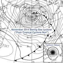 A polar low is a small-scale, short-lived atmospheric low-pressure system (depression) that is found over the ocean areas poleward of the main polar front in both the Northern and Southern Hemispheres. Polar lows were first identified on the meteorological satellite imagery that became available in the 1960s, which revealed many small-scale cloud vortices at high latitudes. The most active polar lows are found over certain ice-free maritime areas in or near the Arctic during the winter, such as the Norwegian Sea, Barents Sea, Labrador Sea and Gulf of Alaska. Polar lows dissipate rapidly when they make landfall. Antarctic systems tend to be weaker than their northern counterparts since the air-sea temperature differences around the continent are generally smaller . However, vigorous polar lows can be found over the Southern Ocean. During winter, when cold-core lows with temperatures in the mid-levels of the troposphere reach −45 °C (−49 °F) move over open waters, deep convection forms, which allows polar low development to become possible.[39] The systems usually have a horizontal length scale of less than 1,000 kilometres (620 mi) and exist for no more than a couple of days. They are part of the larger class of mesoscale weather systems. Polar lows can be difficult to detect using conventional weather reports and are a hazard to high-latitude operations, such as shipping and gas and oil platforms. Polar lows have been referred to by many other terms, such as polar mesoscale vortex, Arctic hurricane, Arctic low, and cold air depression. Today the term is usually reserved for the more vigorous systems that have near-surface winds of at least 17 m/s.[40]