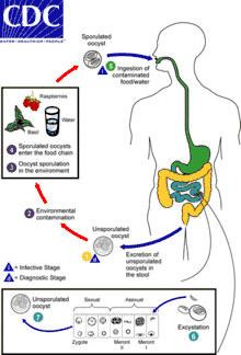 The only confirmed hosts for C. cayetanensis are humans. The protozoan lives out its lifecycle intracellularly within the host's epithelial cells and gastrointestinal tract. Infection is transmitted through the fecal-oral route, and begins when a person ingests oocysts in feces-contaminated food or water. Various chemicals in the host's gastrointestinal tract cause the oocysts to excyst and release sporozoites; generally, two are observed per oocyst. After these sporozoites invade the epithelial cells, they undergo merogony, a form of asexual reproduction that results in many daughter merozoites. These daughter cells may either infect new host cells and initiate yet another round of merogony or take on a sexual track via gametogony: Daughter merozoites become male macrogamonts—which form many microgametes—and female macrogamonts. After fertilization has occurred via male microgamete fusion with female macrogamont, the zygote matures into an oocyst and ruptures the host cell, from which point it is passed with the stool. The oocysts that are passed are not, however, immediately infectious. Sporulation can take from one to several weeks, meaning person-to-person transmission is not a likely problem. This differentiates C. cayetanensis from Cryptosporidium parvum—a closely related organism that causes a similar disease—since C. parvum oocysts are immediately infectious upon release from the host.[5]