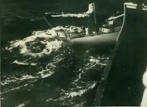 Fenton, Pat, and two volunteers flew to Norfolk Island accompanied by two police officers to extradite the 'pirates', the four returning to Sydney the same afternoon at Fenton's expense.[16][17][18] The party remained on the island to effect minor repairs and sail back to Sydney.[19] This necessitated reduced jury rig, due to damage to rigging and spreaders on both masts along with the deckhouse windows being smashed in with only a tarpaulin to keep out water and weather.