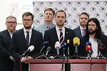 The Czech Pirate Party or Pirates (Czech: Česká pirátská strana, abbreviated Piráti)[2] is a liberal political party in the Czech Republic, founded in 2009. Following the 2017 legislative election, it is the third largest party in the Chamber of Deputies, with 22 out of 200 seats.[14] The parliamentary party sits in opposition to the ruling cabinet and party leader Ivan Bartoš serves as the chairman of the Committee on Public Administration and Regional Development.[15] The party is represented by five Members of the Senate of the Czech Republic, the most recently elected being Adéla Šípová and David Smoljak in 2020 and Lukáš Wagenknecht in 2018. That same year, the party entered a number of municipal assemblies and formed a governing coalition in the Prague City Assembly, with Zdeněk Hřib becoming the Mayor of Prague. In the 2019 European election, the party gained three MEPs, joined the Greens–European Free Alliance parliamentary group and campaign leader Marcel Kolaja was elected one of fourteen Vice-Presidents of the European Parliament. The party holds 99 out of 675 seats in regional councils since the October 2020 elections.